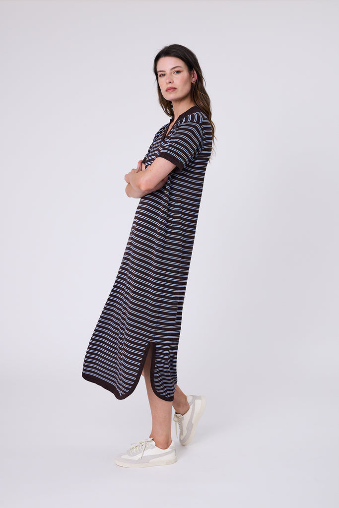 The Chime Knit Polo Dress in Carob Stripe offers an effortless silhouette that balances comfort with style. Crafted in a custom stripe knit with a dark brown base and pale blue stripes, it’s made from a premium cotton-modal blend that combines the strength and breathability of cotton with the silky softness and drape of modal. The result is a lightweight, durable yarn that feels smooth and luxurious against the skin. Designed with a relaxed fit and straight cut, this polo tee dress falls to a midi-to-maxi length, finished with short sleeves, a quarter placket, side splits and a curved hem for added movement and shape. Style it with a cap and sneakers for errands on the go, or switch to sandals for a beach-to-brunch ready look.