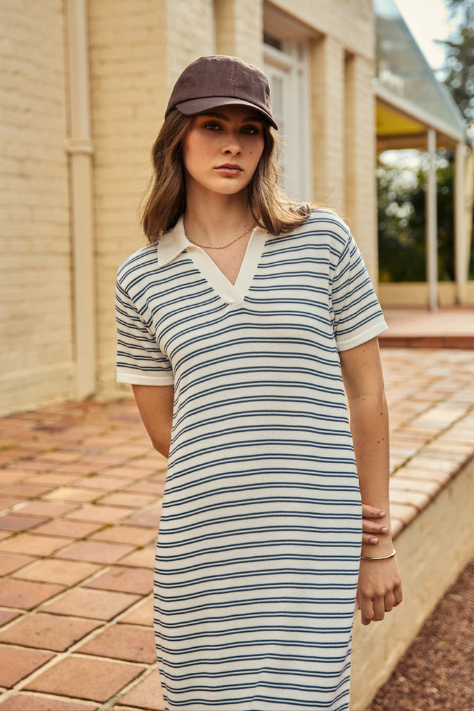 The Chime Knit Polo Dress in Indigo Stripe offers an effortless silhouette that balances comfort with style. Crafted in a custom stripe knit with an ivory base and indigo blue stripes, it’s made from a premium cotton-modal blend that combines the strength and breathability of cotton with the silky softness and drape of modal. The result is a lightweight, durable yarn that feels smooth and luxurious against the skin. Designed with a relaxed fit and straight cut, this polo tee dress falls to a midi-to-maxi length, finished with short sleeves, a quarter placket, side splits and a curved hem for added movement and shape. Style it with a cap and sneakers for errands on the go, or switch to sandals for a beach-to-brunch ready look.