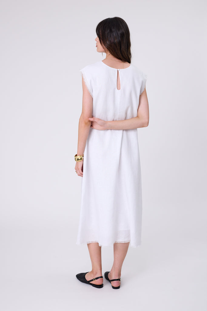 Chic and effortless, the Costa Linen Dress transitions seamlessly through all summer occasions. Crafted from refined European linen that offers beautiful drape and lasting quality, it falls in a flattering A-line silhouette and finished with frayed cap sleeves for an elevated edge. Featuring a centre front seam detail, keyhole button closure, and a softly frayed hem, this dress pairs perfectly with heeled sandals for an elevated look or slides for relaxed summer days.