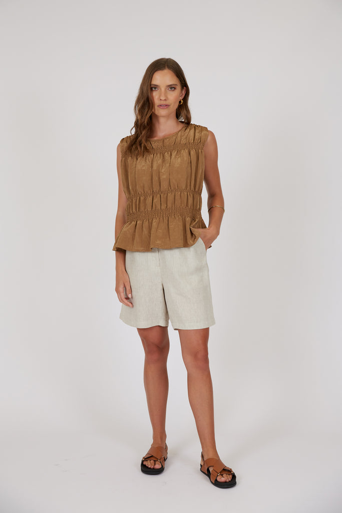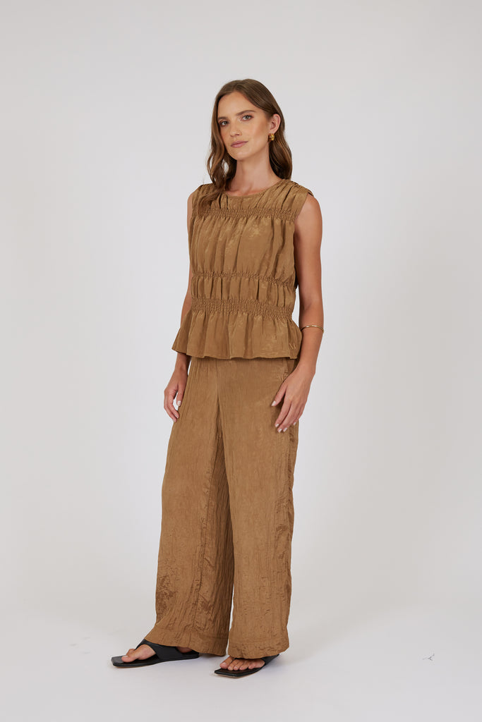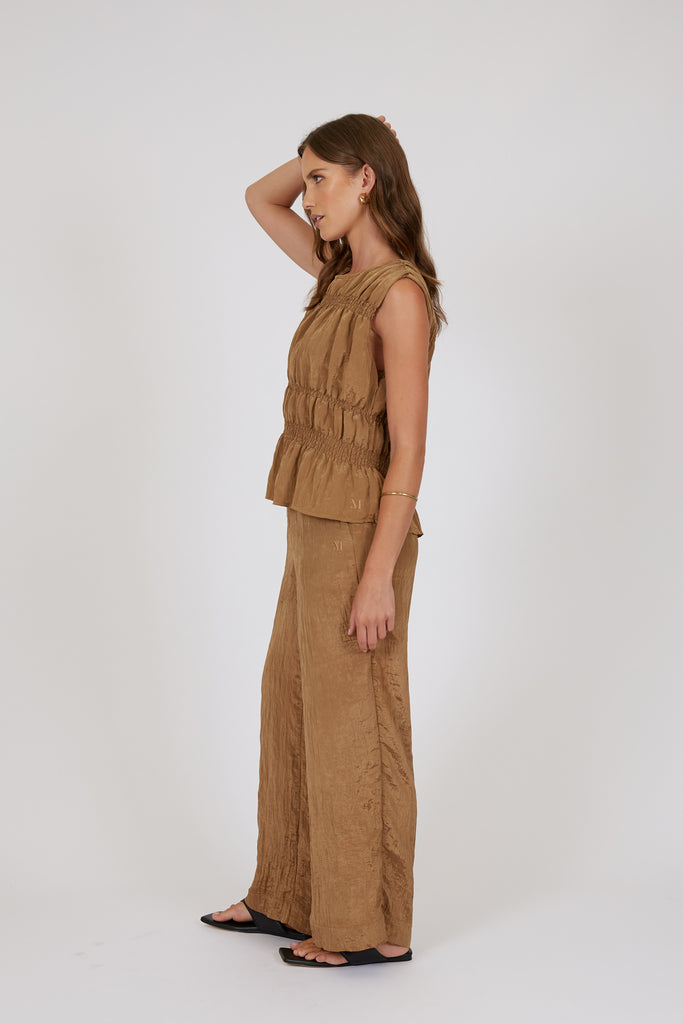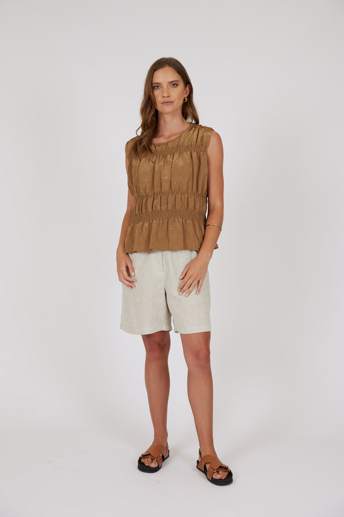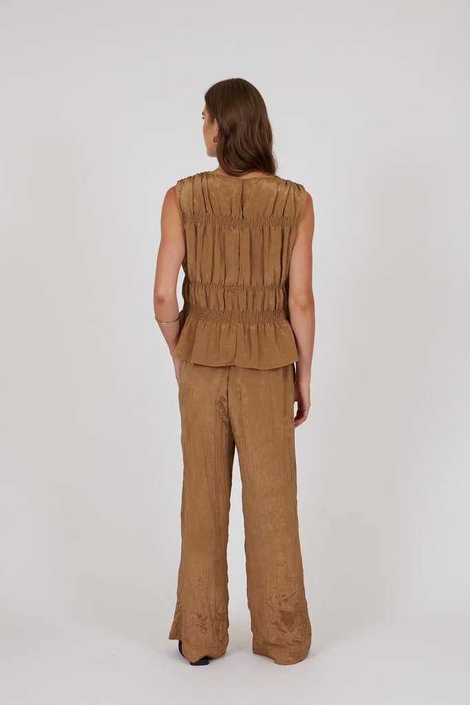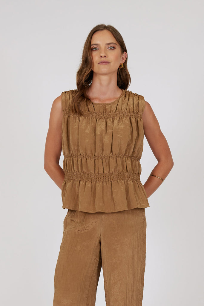 Made for balmy days and golden-hour evenings, the Lumi Top brings a touch of polish to every outfit. Crafted from a lightweight, crinkled fabric with a subtle sheen, it’s designed for a relaxed fit. This sleeveless top features shirred panels across the bodice, adding soft texture and shape, and is finished with a keyhole back closure. Style with the matching Lumi Pant for a put-together look that feels elevated and easy to wear.