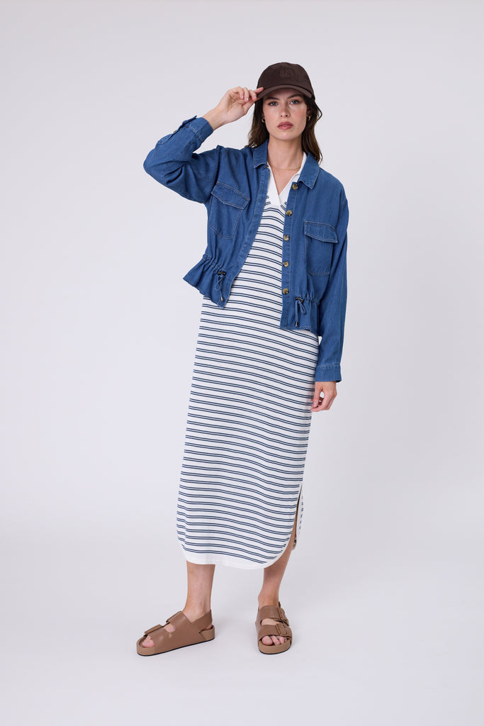 The Chime Knit Polo Dress in Indigo Stripe offers an effortless silhouette that balances comfort with style. Crafted in a custom stripe knit with an ivory base and indigo blue stripes, it’s made from a premium cotton-modal blend that combines the strength and breathability of cotton with the silky softness and drape of modal. The result is a lightweight, durable yarn that feels smooth and luxurious against the skin. Designed with a relaxed fit and straight cut, this polo tee dress falls to a midi-to-maxi length, finished with short sleeves, a quarter placket, side splits and a curved hem for added movement and shape. Style it with a cap and sneakers for errands on the go, or switch to sandals for a beach-to-brunch ready look.