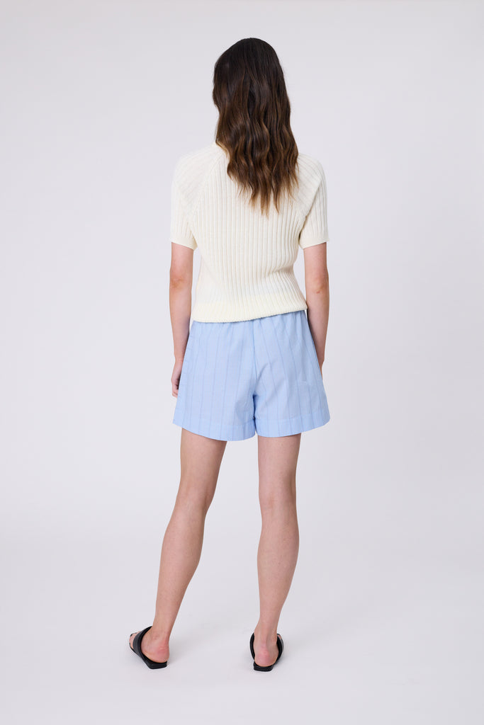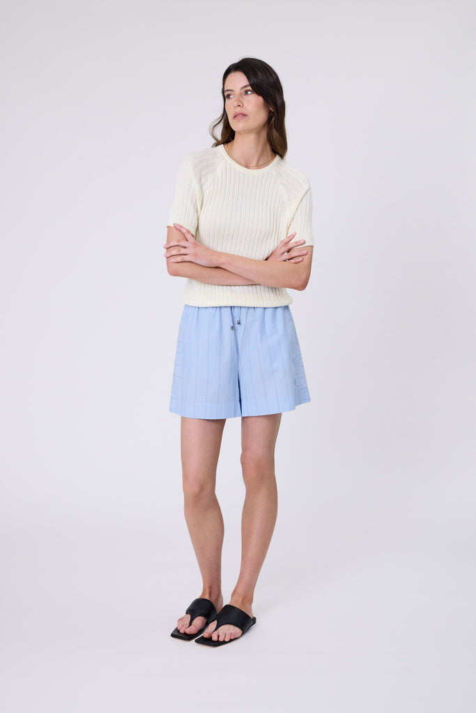 A reimagined favourite, The Wisp Knit Tee in Butter is a versatile staple crafted in a wide ribbed knit for subtle texture and structure. Cut in a tried-and-true shape, this knitted tee offers a regular fit with a classic crew neckline, raglan shoulders and short sleeves. Finished with fine ribbing at the neck, cuffs and hem, this mid-weight cotton knit is breathable, comfortable, and ideal for year-round wear. Style it solo through the warmer months or wear it as a layer when the temperature drops.