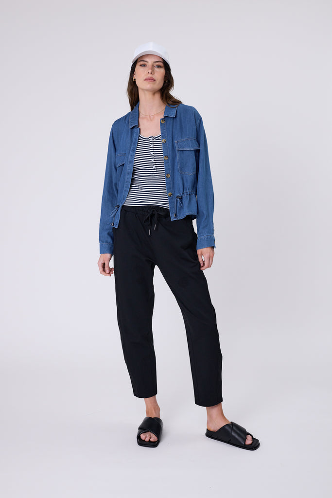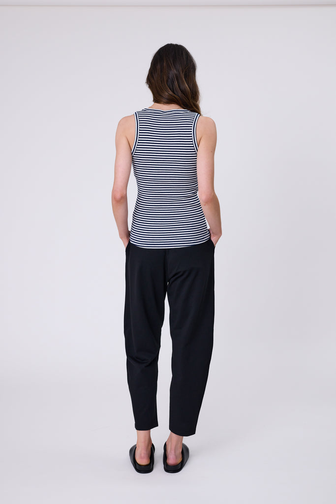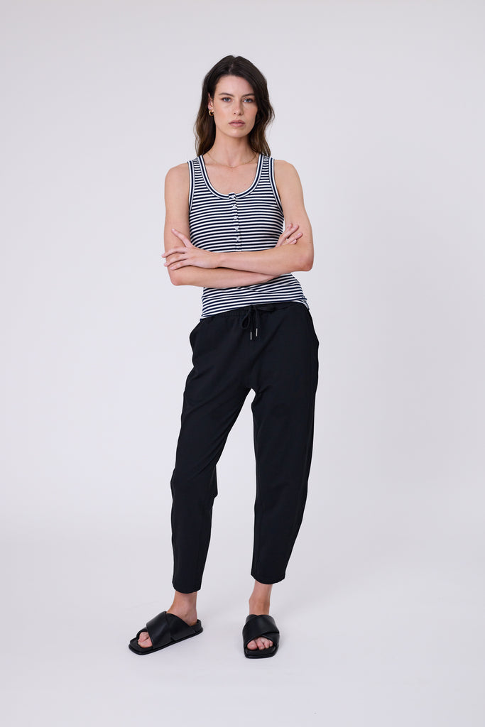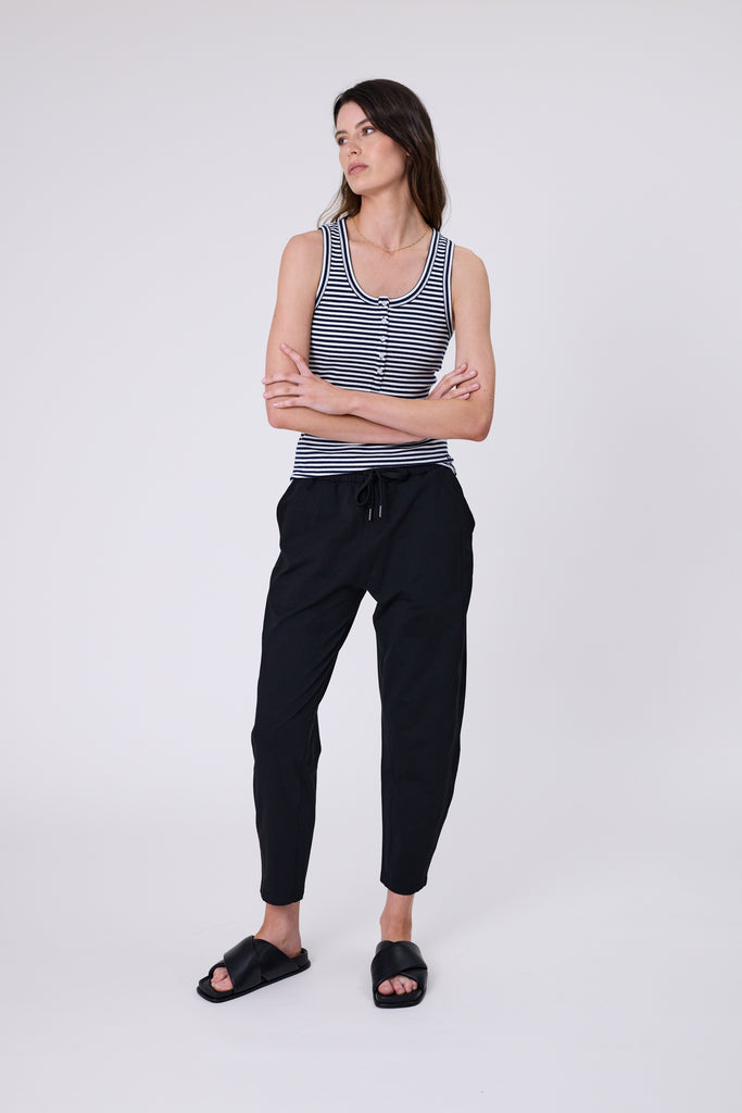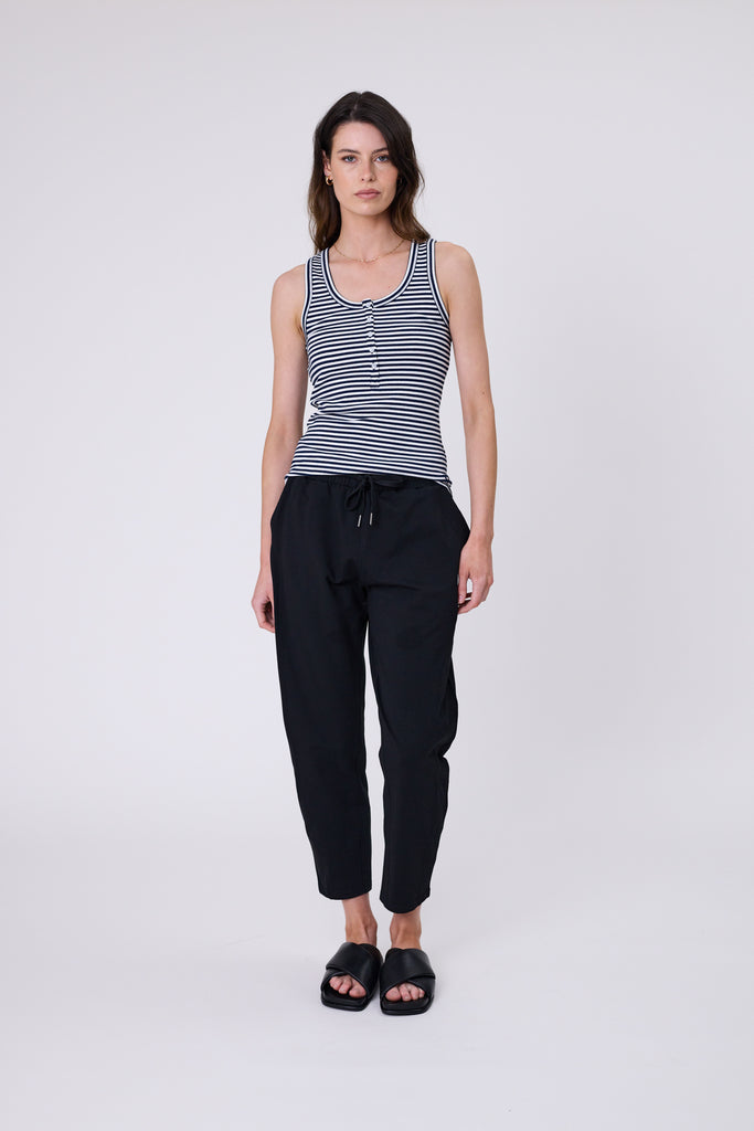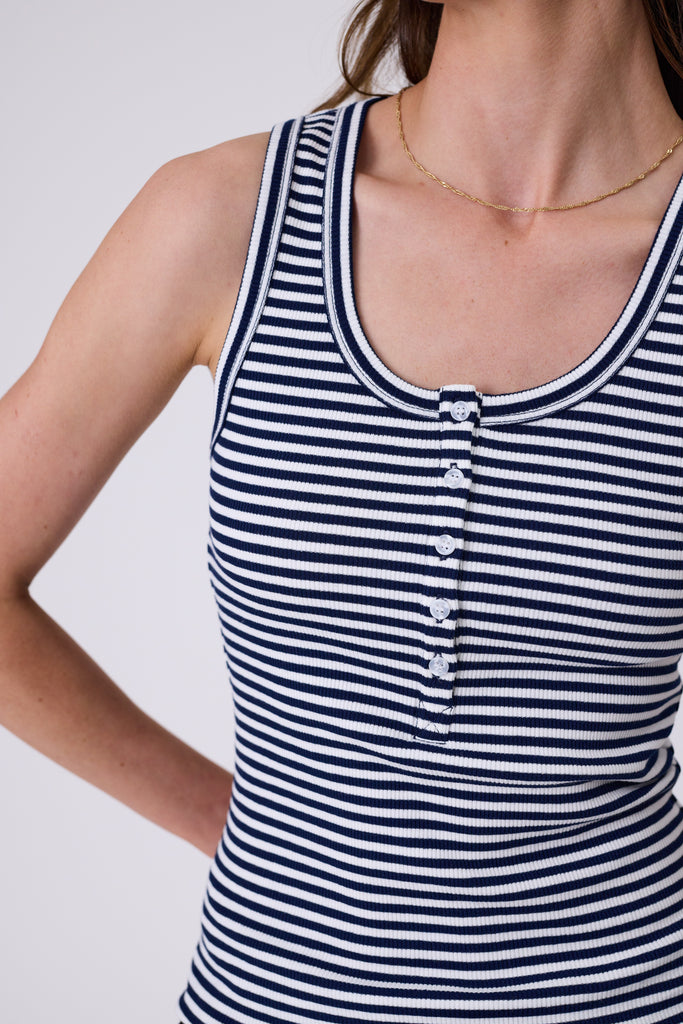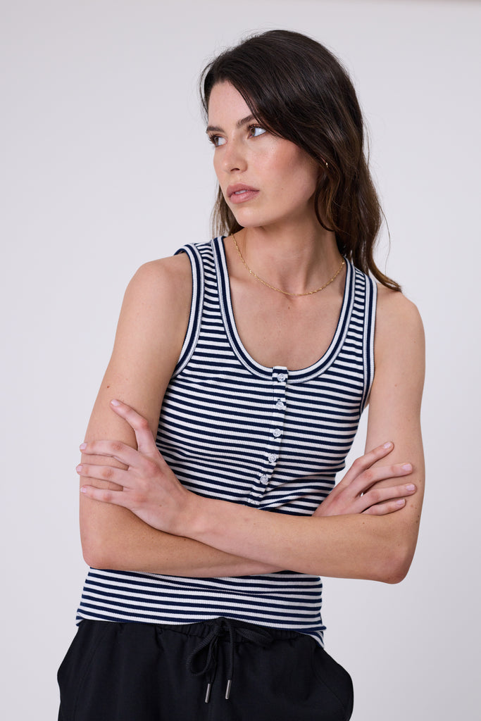 A versatile wardrobe staple, the Essence Henley Tank adds a subtle pop of stripe to any outfit. Crafted from soft cotton stretch knit fabric with a fine rib-knit texture, it features a flattering scoop neckline and slim silhouette. Perfect layered under shirts and cardigans, or simply worn on its own.
