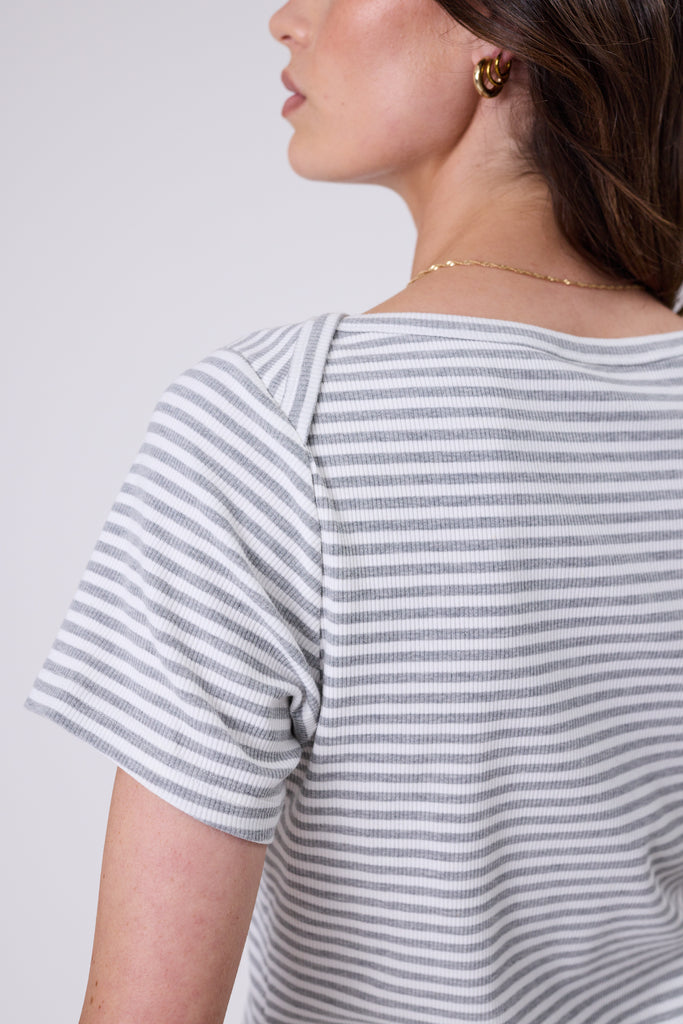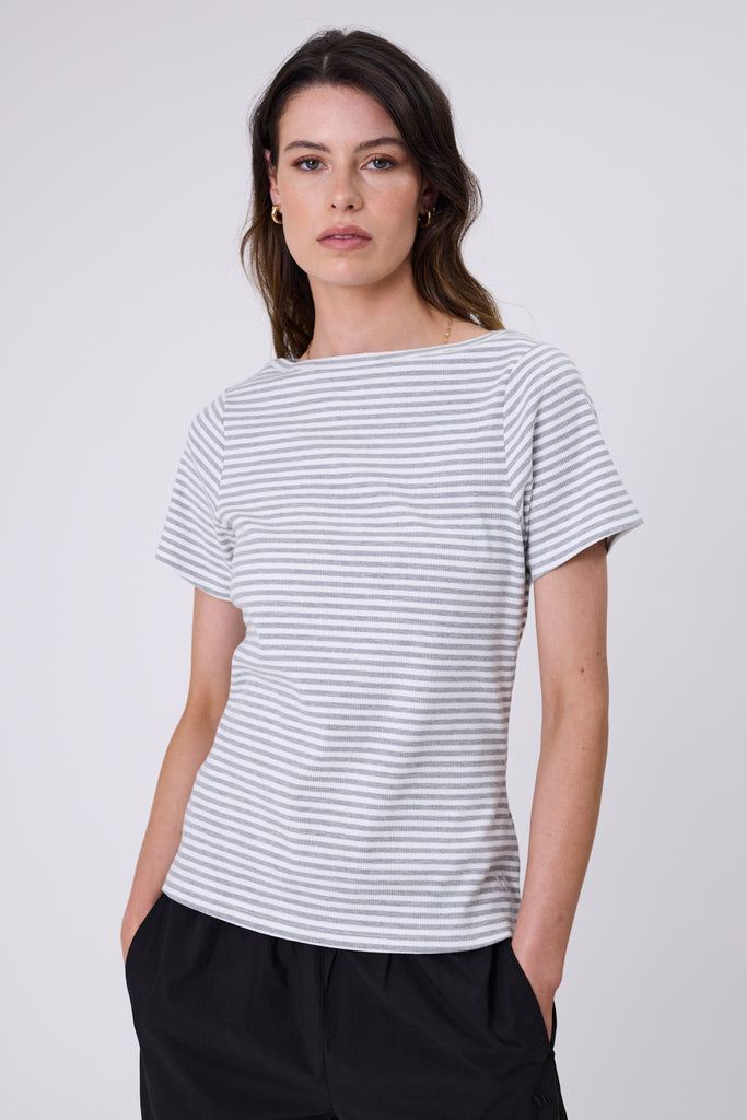 Endlessly versatile, our Essence Rib Tee brings a fresh pop of stripe to your everyday rotation. Designed in a slim-fit silhouette with short sleeves and a flattering boat neckline, it’s finished with a subtle cross-over detail at the shoulder for a refined touch. Crafted in a soft cotton rib knit with an elongated length, it pairs effortlessly with everything from shorts and denim to linen trousers.