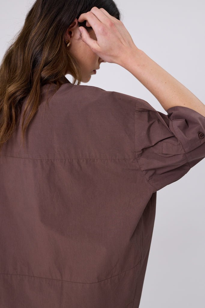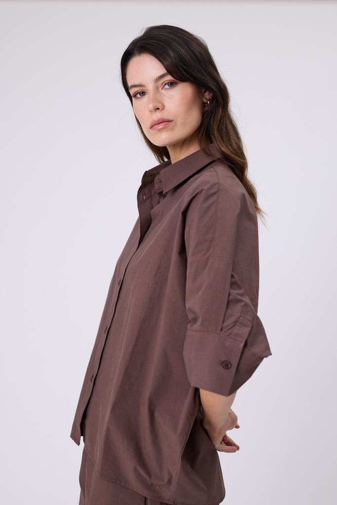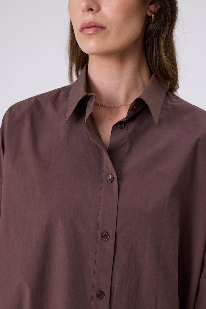 A twist on a classic, the Shoreline Short in Carob is a must-have for easy summer styling. Features an oversized, boxy fit with dropped shoulders and half sleeves finished with a wide cuff. Made from premium stonewashed cotton poplin, this shirt offers breathable comfort and a luxurious hand-feel. The back yoke and seam details add subtle structure and volume, and the curved high-low hem creates a flattering shape. Versatile and easy to style, wear it buttoned up for work, open as a lightweight layer, or paired with the matching Shoreline Short for effortless summer outfitting.